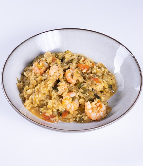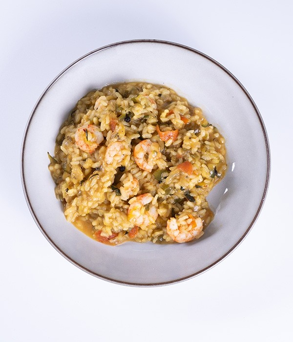INGREDIENTES: Caldo de pescado (agua, pescado de roca, zanahoria, puerro, tomate, apio), Calabacín (13%), gambas (parapenaeus langirostris) (CRUSTÁCEOS) (12%), arroz (11%), cebolla, tomate, vino fino de Jerez, pimiento verde, aceite de oliva virgen extra, sal, pimienta negra, azafrán.
