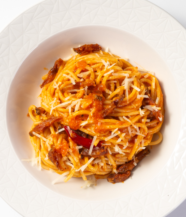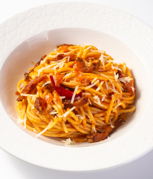 Un plato con carácter, con historia, con alma. Imagínate esos spaghetti al dente, perfectos, bañados en una salsa que es un canto a la tradición italiana. Tomate, guanciale crujiente, un toque de peperoncino y ese queso Pecorino que corona la obra maestra. Es un festival de sabores que te transporta a un pequeño pueblo en las colinas de Amatrice, donde cada ingrediente cuenta una historia. Un plato que te hace querer abrir una botella de vino y disfrutar despacio, saboreando cada bocado como si fuera el último. ¡Esto es la auténtica magia de la cocina italiana!