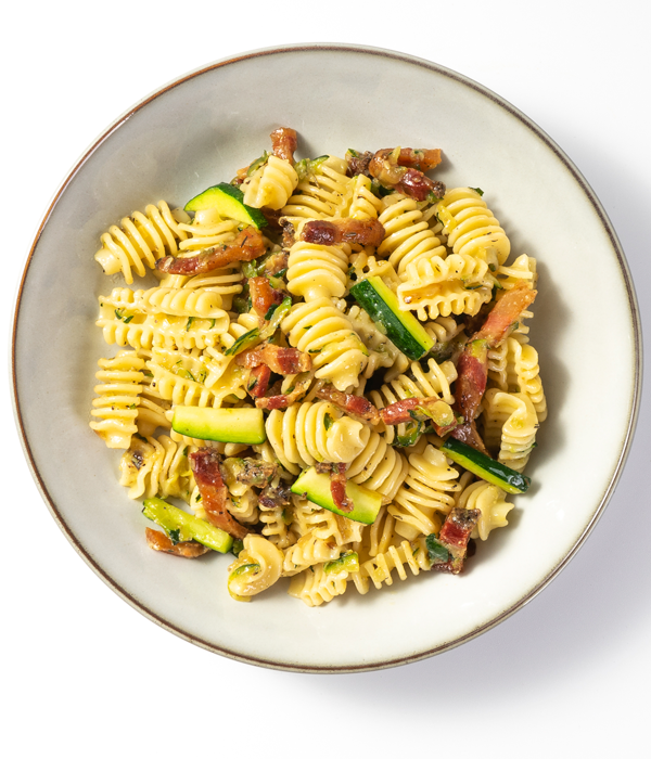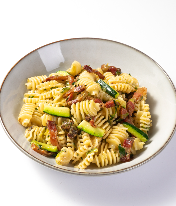 INGREDIENTES: Calabacín (34%), radiatori (GLUTEN) (30%), guanciale (23%), cebolla, agua,aceite de oliva virgen extra, sal, pimienta negra, tomillo seco.