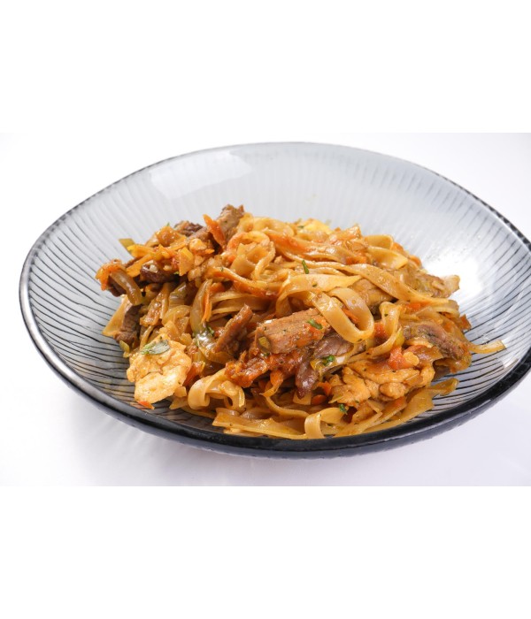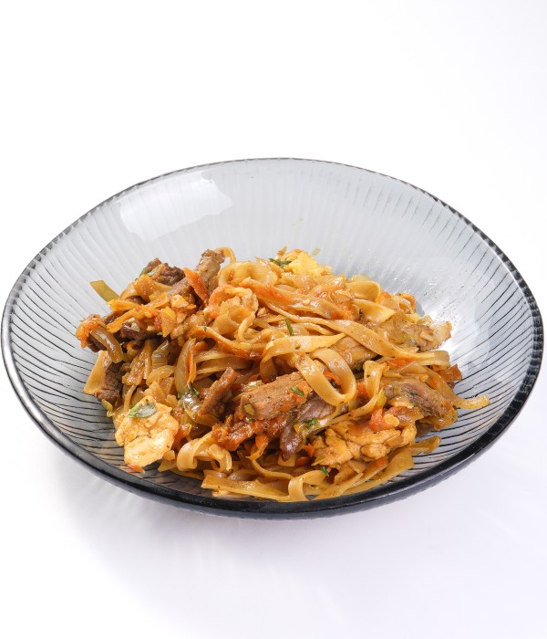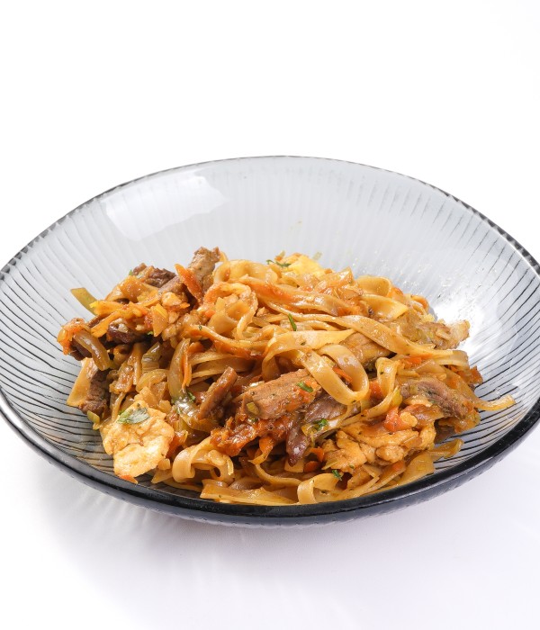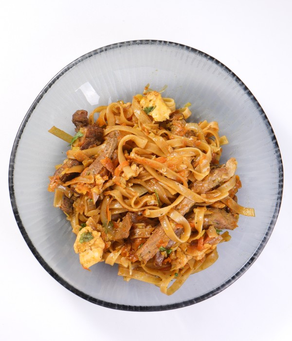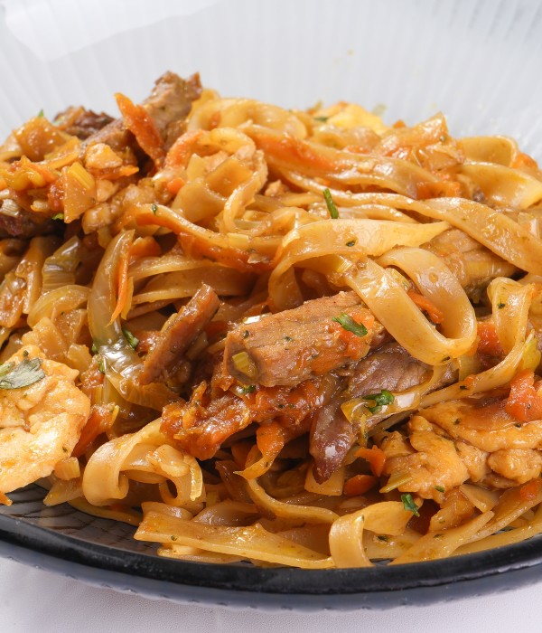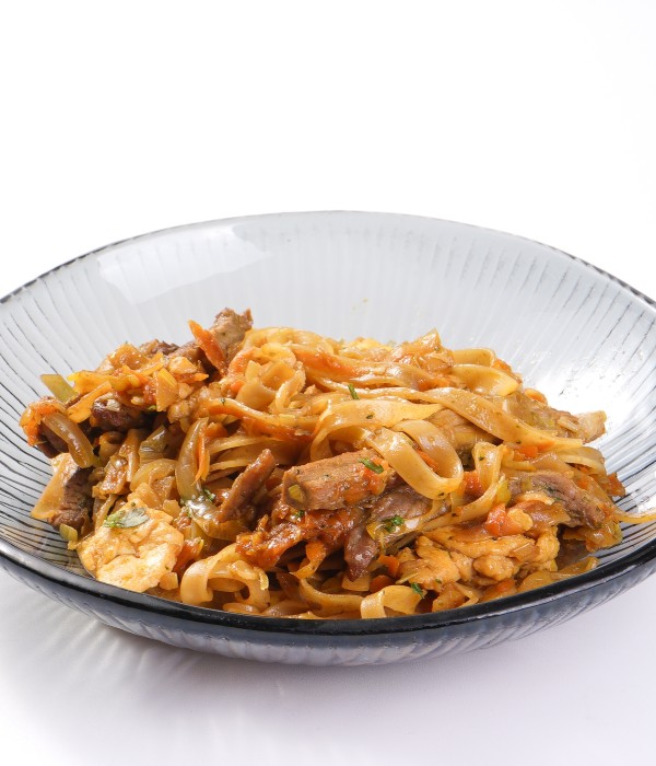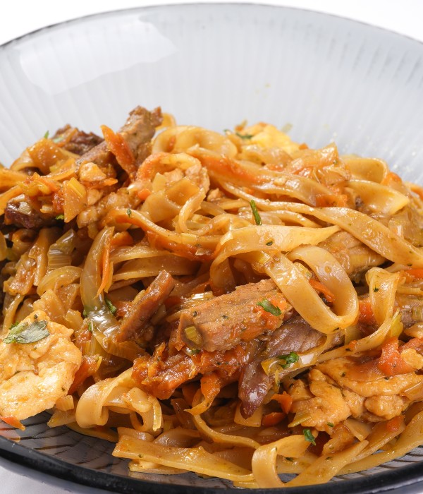 Un wok sabroso y equilibrado, con ternera salteada, verduras frescas, fideos de arroz y trocitos de huevo revuelto que sorprenden en cada bocado.