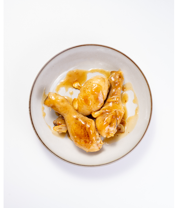 INGREDIENTES: Pollo (55%), caldo de pollo [agua, carcasas de pollo (21%), cebolla, puerro, zanahoria, apio (APIO)], brandy, limón, aceite de oliva virgen extra, azúcar moreno, ajo, fécula de maíz, sal, comino, pimienta negra.