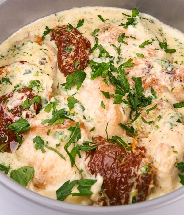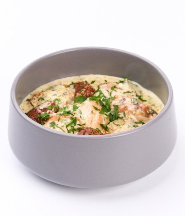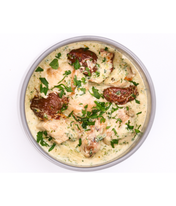 INGREDIENTES: Pechuga de pollo (42%), nata líquida (LÁCTEOS), cebolla, tomate, aceite de oliva virgen extra, espinacas, tomates secos, ajo, queso grana padano (HUEVOS, LÁCTEOS), sal, goma xantana, pimienta negra molida, orégano seco.