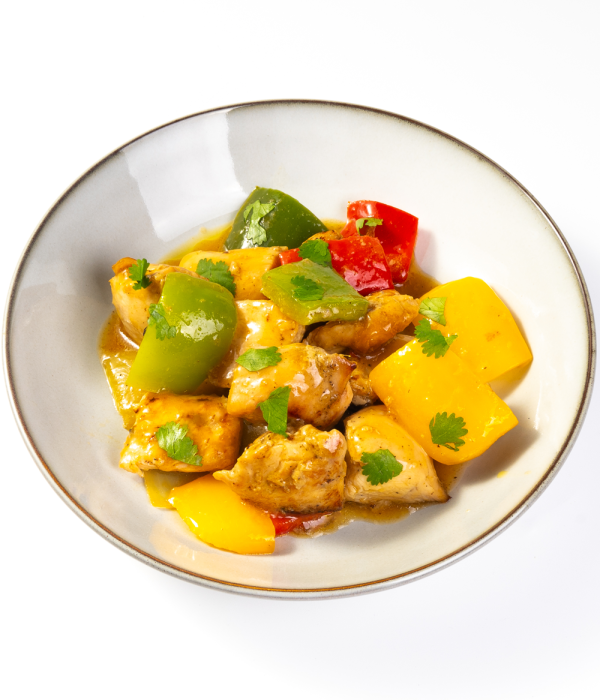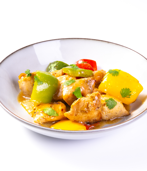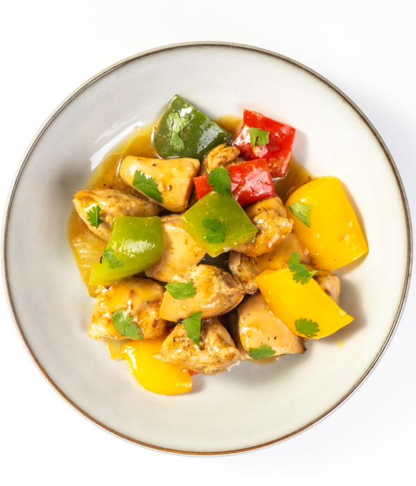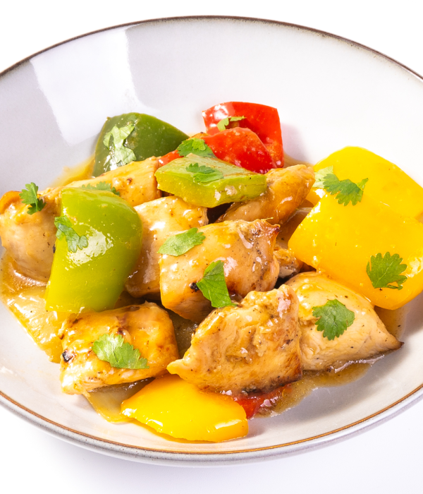 INGREDIENTES: Pechuga de pollo (47%), pimiento rojo (13%), pimiento verde (12%), cebolla(11%), caldo de pollo [agua, carcasas de pollo (21%), cebolla, puerro,zanahoria, apio (APIO)], miel, salsa de soja (GLUTEN, SOJA), ajo,aceite de oliva virgen extra, fécula de maíz, jengibre, sal, pimienta negra.