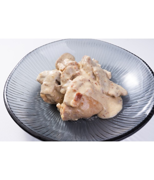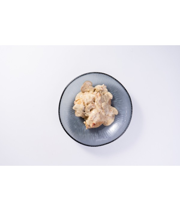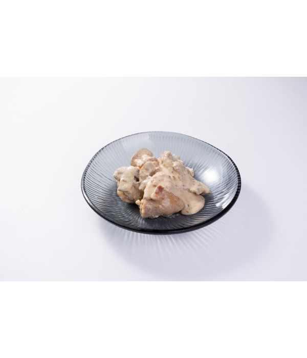 Jugosos contramuslos de pollo deshuesados, cocinados lentamente para que queden tiernos y llenos de sabor, acompañados de una cremosa salsa carbonara elaborada con nata, bacon crujiente y champiñones laminados.