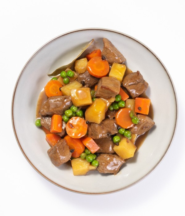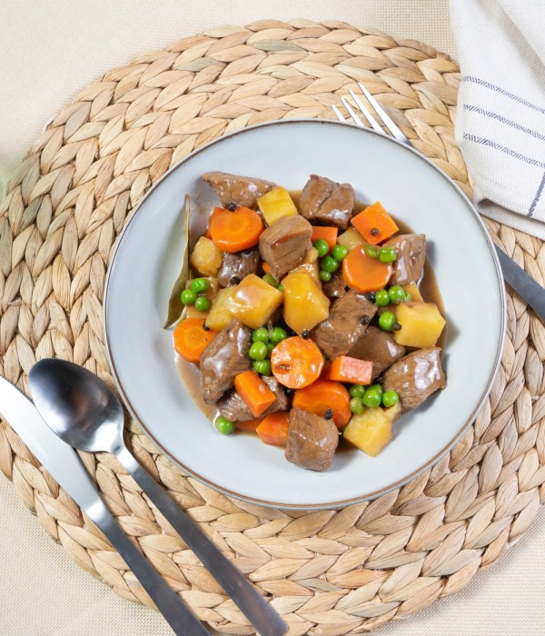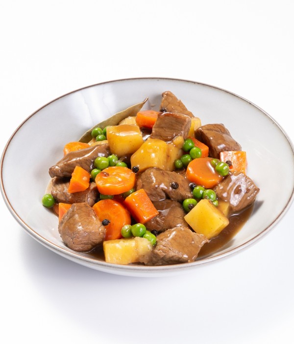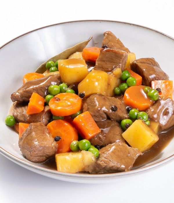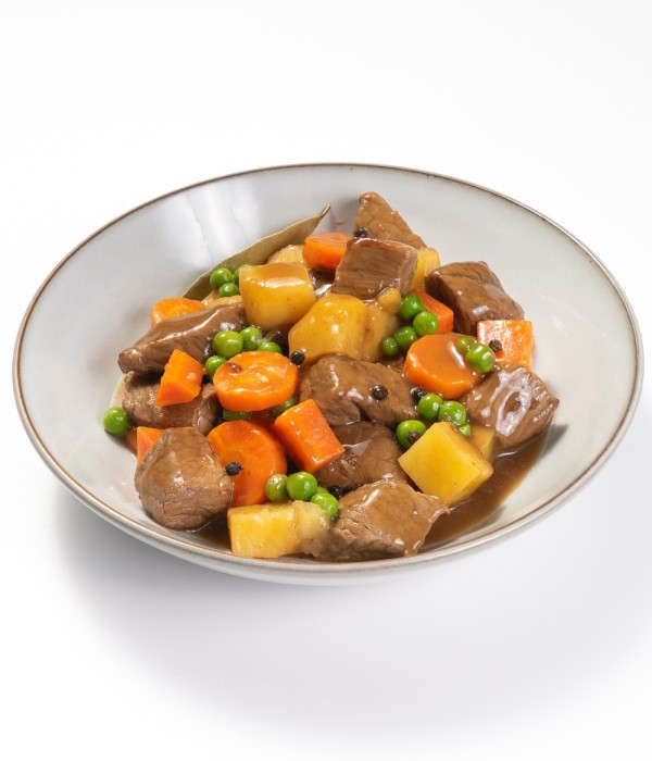 INGREDIENTES: Ternera (35%), salsa jardinera [agua, zanahoria, cebolla, guisantes, patatas, tomate, aceite de oliva virgen extra, vino blanco, puerro, apio (APIO), sal, ajo, azúcar, pimienta negra, pimienta blanca], patatas, caldo de pollo [agua, carcasas de pollo, cebolla, puerro, zanahoria, apio (APIO)], aceite de oliva virgen extra, tomate frito [tomate, cebolla, azúcar, aceite de oliva virgen extra, sal, ajo, pimienta], sal, pimienta negra, laurel.
