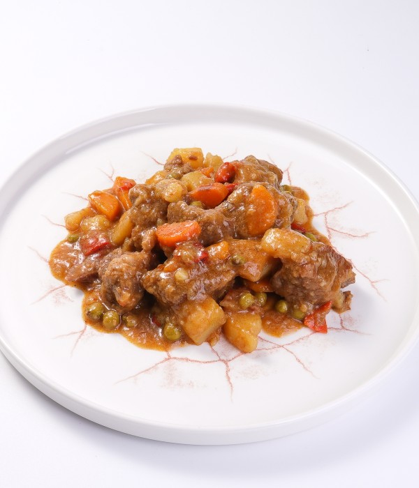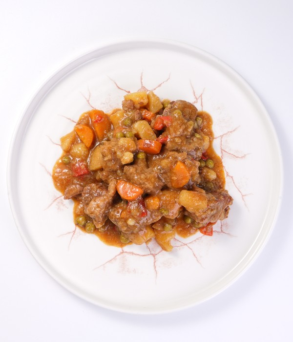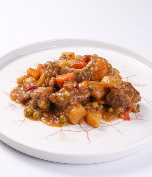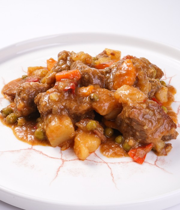 Guiso de ternera cocinado con verduras, vino tinto y un toque de pimiento choricero. Sabor intenso, textura melosa y salsa ligada. Ideal para mojar pan.