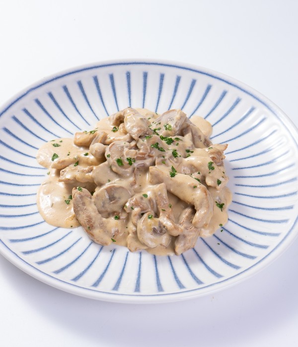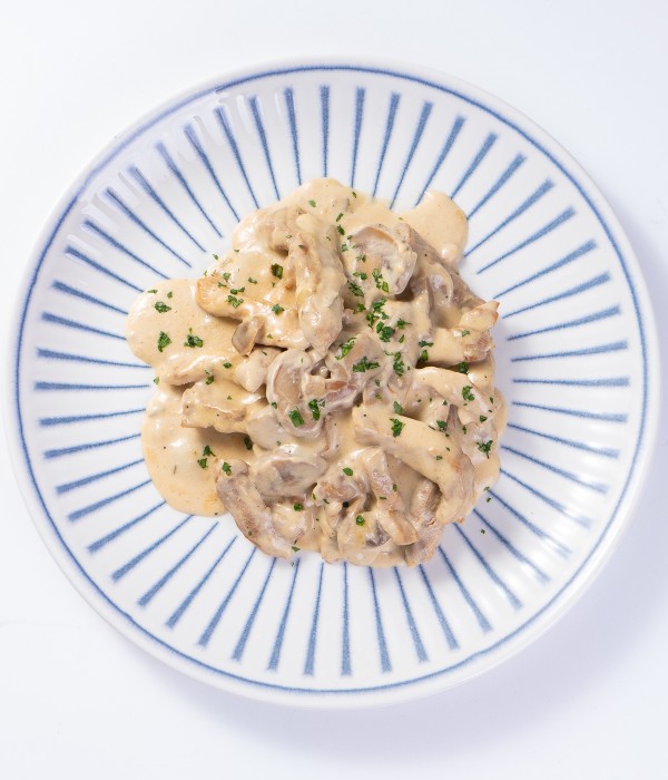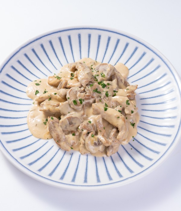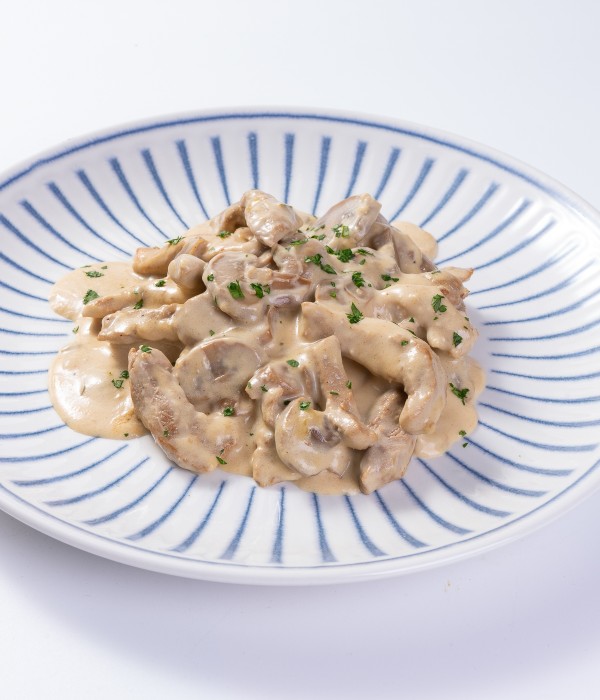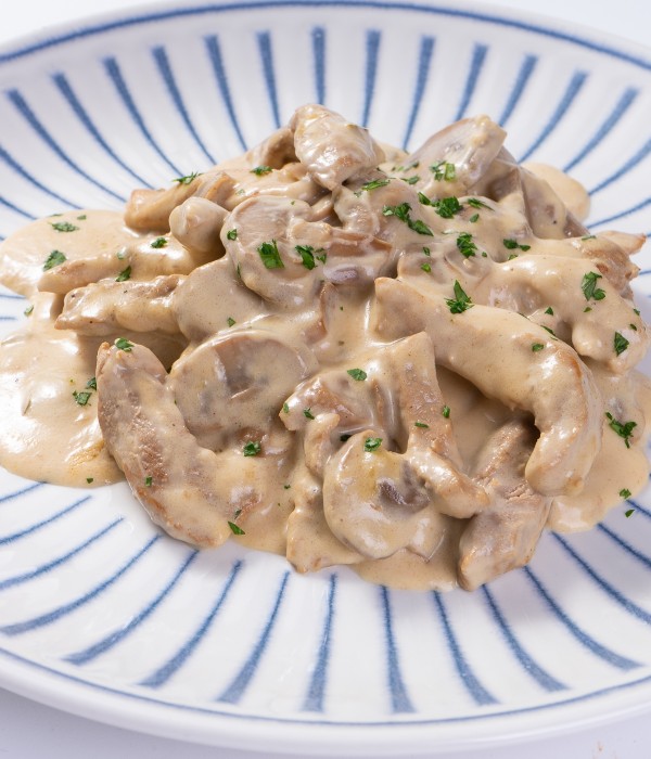 La receta se elabora en principio con solomillo de ternera o buey, pero en Qchara te la preparamos con solomillo de cerdo, una carne blanca, tierna y jugosa que cortamos en tiritas para que se impregne bien en la deliciosa salsa compuesta fundamentalmente a base de cebolla, champiñones, pepinillos, mantequilla, nata, brandy y mostaza de Dijon.