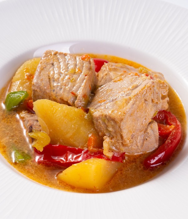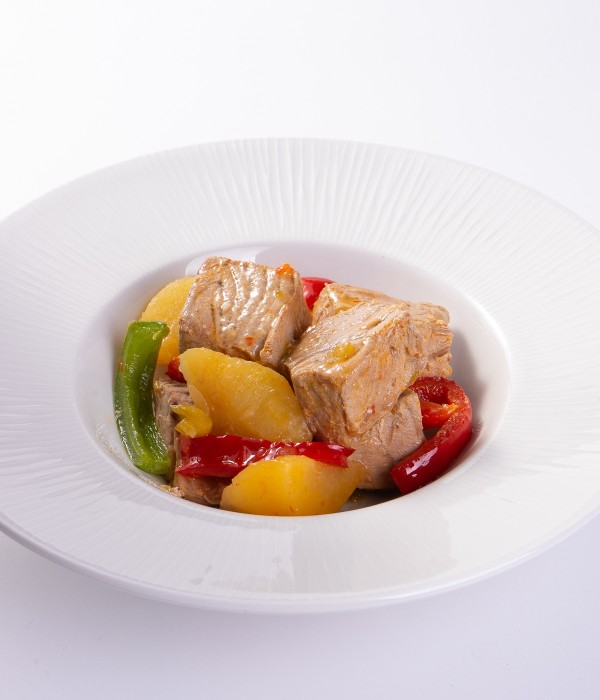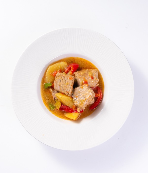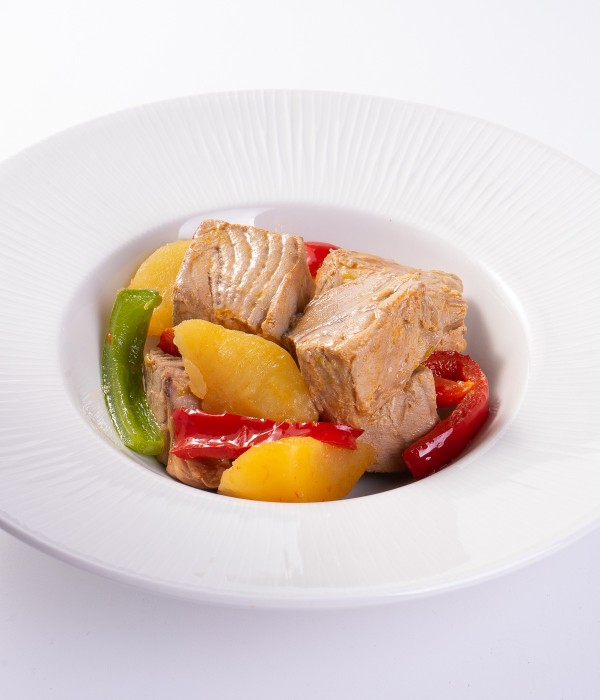 El marmitako de atún rojo es un guiso tradicional de pescadores del País Vasco y Cantabria en España, elaborado con atún rojo de la máxima calidad, patatas, pimientos verde y rojo y tomate. Este plato se sazona con ajo y pimiento choricero, creando un caldo sabroso y aromático. Originariamente, se preparaba a bordo de los barcos utilizando bonito del norte, nosotros lo elevamos un peldaño más usando nuestro espectacular atún rojo presente en las costas gaditanas. El marmitako, cuyo nombre proviene de "marmita", el recipiente en que se cocina, es valorado por su sencillez y profundo sabor marino, siendo un reflejo de la cocina casera y tradicional del norte de España.