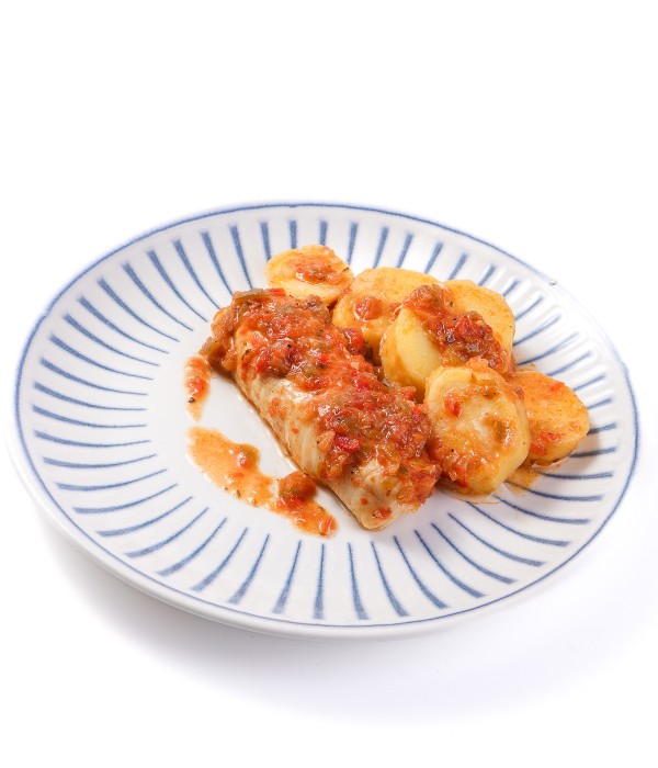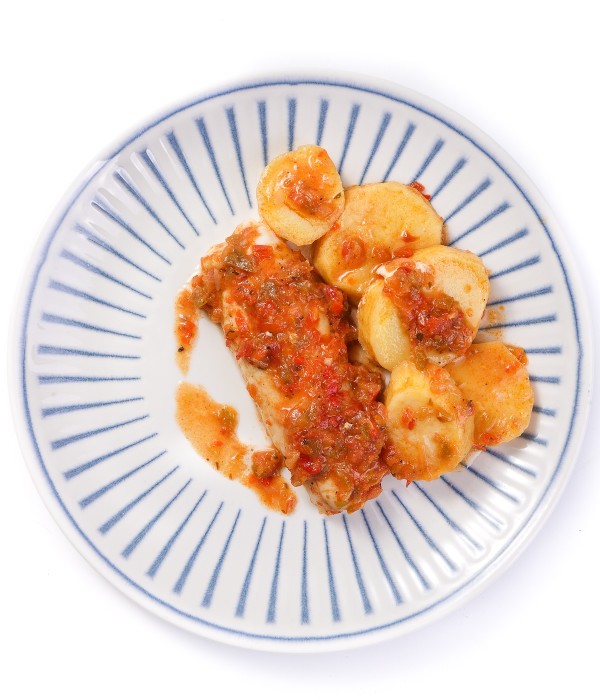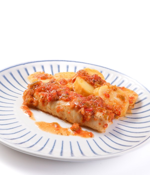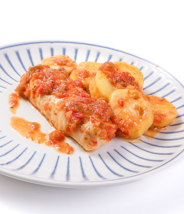 Merluza (Merluccius capensis) cocinada al estilo roteño con patata y una salsa tradicional de tomate, pimiento verde y rojo, cebolla y ajo, enriquecida con vino blanco, brandy y especias como laurel, orégano y clavo. Un guiso casero y sabroso donde el aceite de oliva virgen extra realza el conjunto, logrando un plato jugoso y aromático, perfecto para disfrutar con pan o como plato único.