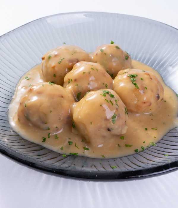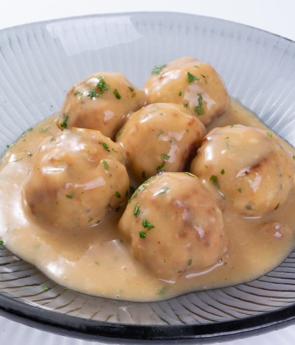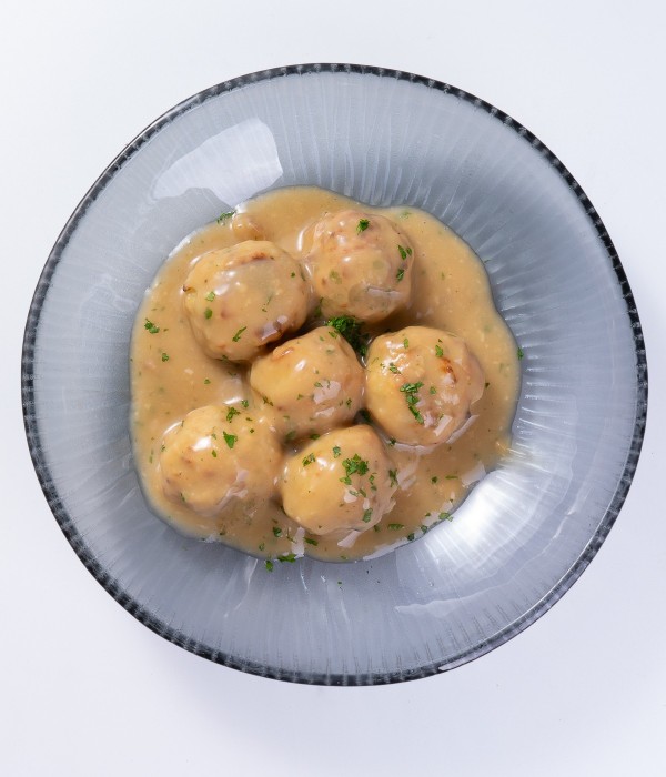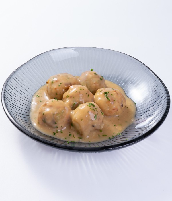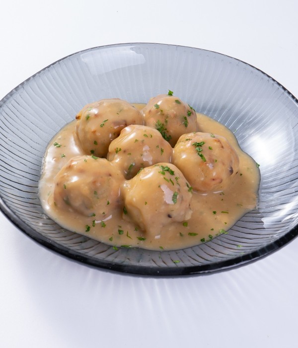 Nuestras Albóndigas de Choco y Gambas en salsa de vino fino son un plato marinero auténtico, elaborado con choco fresco y gamba arrocera, picados y ligados a mano para conseguir una textura suave, jugosa y llena de sabor. La mezcla se integra con pan rústico, verduras frescas y un toque de huevo campero en polvo, logrando unas albóndigas tiernas y equilibradas.