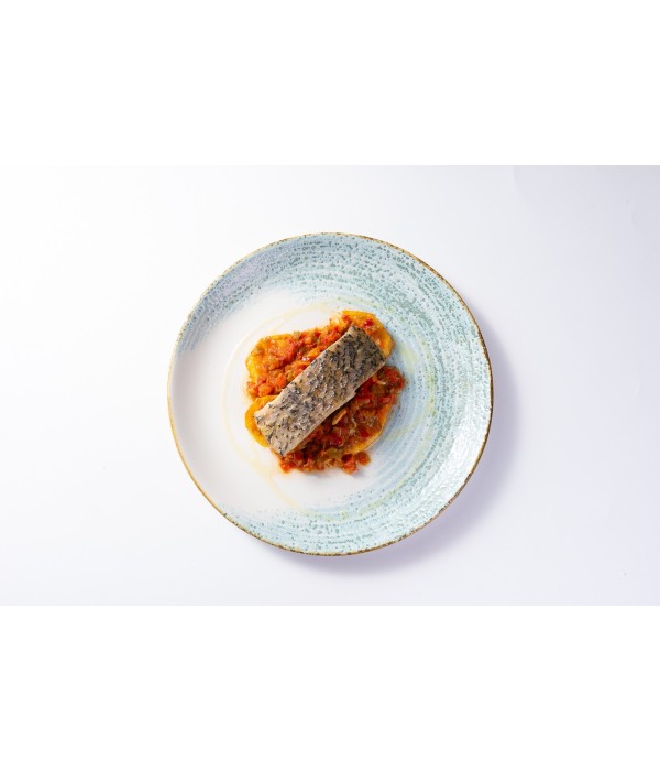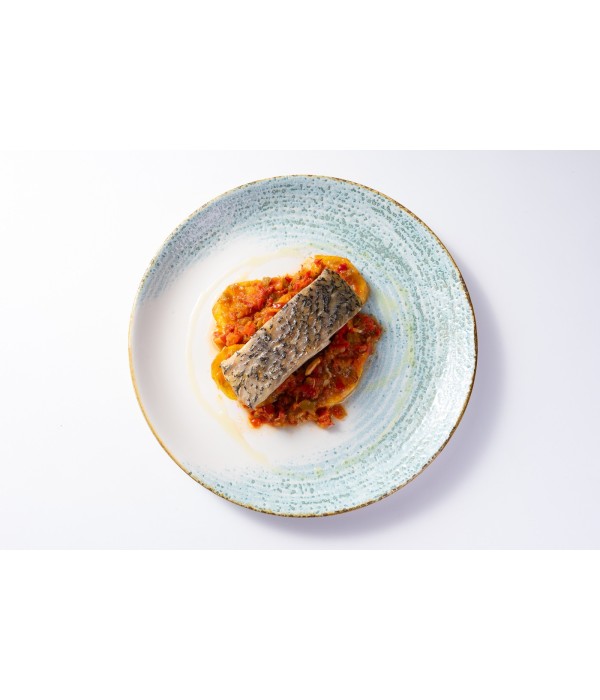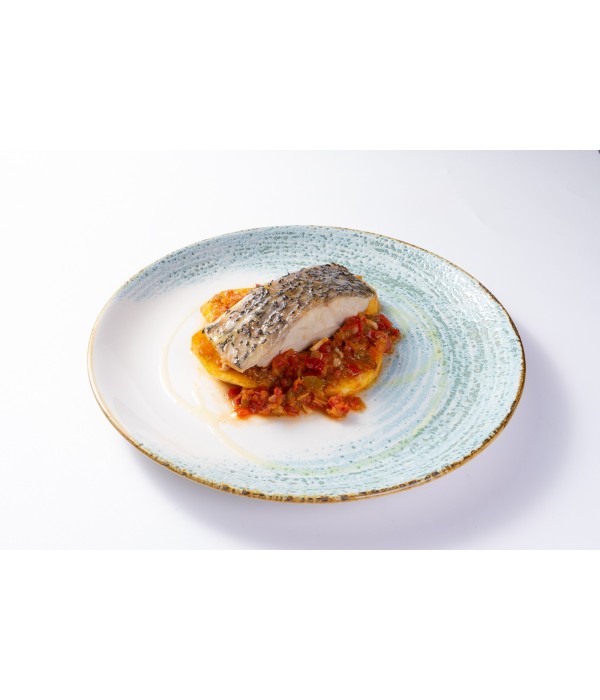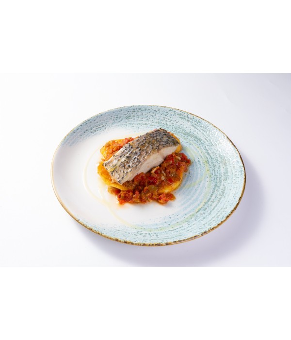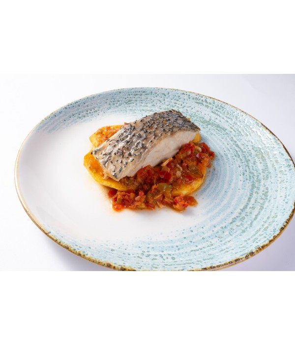Pero ojo, que no viene sola. Se marca un baile con el "terruño" en una base de sofrito de los de antes: tomate de la huerta, pimiento rojo, verde, cebollita y ese toque de laurel que huele a cocina de abuela. ¿El secreto? El mimo. La verdura se pocha a fuego lento hasta que se convierte en una melaza dulce que abraza al lomo de pescado, rematado con un chorreoncito de vino y brandy de Jerez para que no se nos olvide dónde estamos, y por supuesto unas patatitas de base.