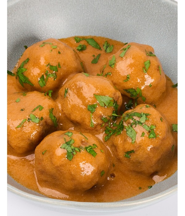 INGREDIENTES: Salsa de manzanilla marinera para albóndigas de merluza y gambas (53%) [(agua, cebolla, cabezas de rape (PESCADO)(10%), tomate, manzanilla de Sanlúcar (vino), aceite de oliva virgen extra, ajo, zanahoria, puerro, harina de trigo (GLUTEN), apio (APIO), sal, azúcar, pimentón dulce de La Vera, laurel, pimienta negra], albóndigas de merluza y gambas [(sin salsa) (47%) (merluza (PESCADO) (55%), cebolla, gambas (CRUSTÉCEOS) (parapenaeus langirostris) (8%), manzanilla de Sanlúcar (vino), pan (GLUTEN), harina de trigo (GLUTEN), huevos (HUEVO), aceite de oliva virgen extra, ajo, sal, perejil, pimienta negra]