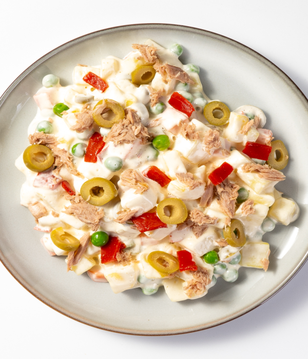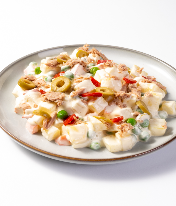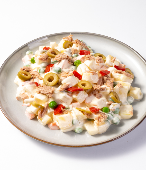 INGREDIENTES: Patatas, mayonesa [aceite de soja (65%), agua, yemas dehuevo (HUEVOS) (5%), vinagre de vino blanco, azúcar, sal, almidón modificado de maíz,zumo de limón concentrado, antioxidante E-385, extracto de pimentón,colorantes (carotenos)], guisantes, zanahoria, atún (PESCADO)(5%), aceitunas verdes deshuesadas, pimiento del piquillo, sal.