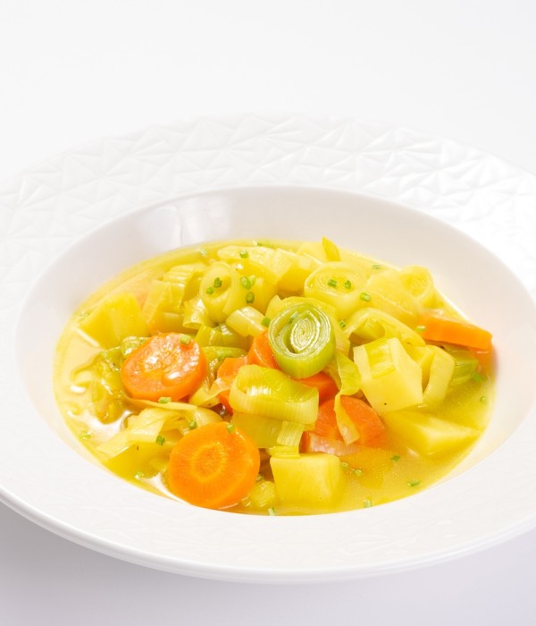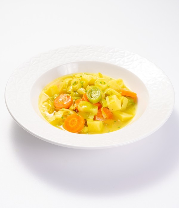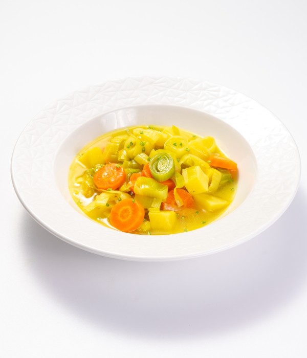 INGREDIENTES: Caldo de verduras [agua, tomate, puerro, zanahoria, apio (APIO), aceite de oliva virgen extra, sal], patatas, puerro, zanahoria, aceite de oliva virgen extra, sal, pimienta negra.