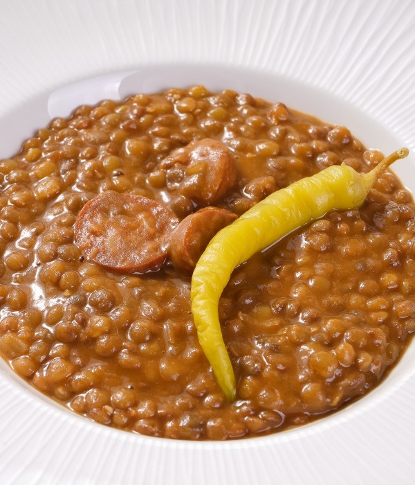 INGREDIENTES: Agua, lenteja pardina (17%), chorizo (10%), cebolla, tomate, pimiento verde, aceite de oliva virgen extra, sal, piparras, ajo, pimentón dulce de La Vera, laurel.