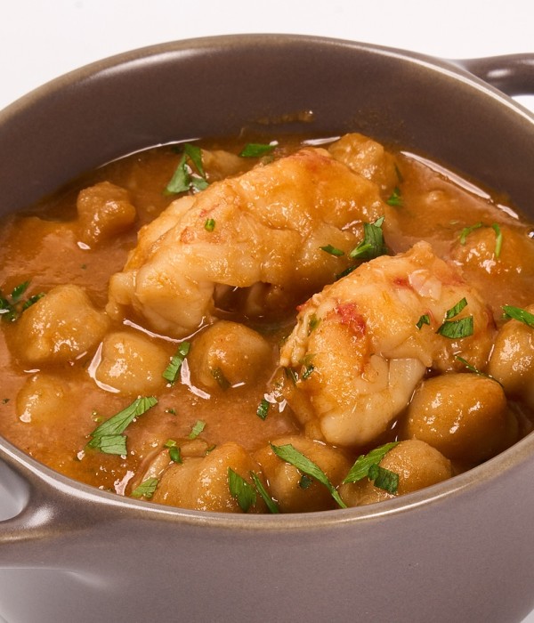 INGREDIENTES: Agua, gambón (pleoticus muelleri) (CRUSTÁCEOS) (29%), garbanzos secos (6%), tomate, cebolla, pimiento rojo, manzanilla de Sanlúcar (2%) (vino), pimiento verde, aceite de oliva virgen extra, ajo, sal, pimentón dulce de La Vera, perejil, pimienta negra, laurel, cayena.