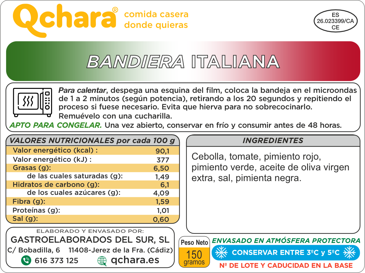INGREDIENTES: Cebolla, tomate, pimiento rojo, pimiento verde, aceite de oliva virgen extra, sal, pimienta negra.