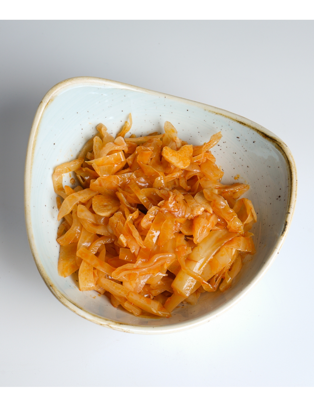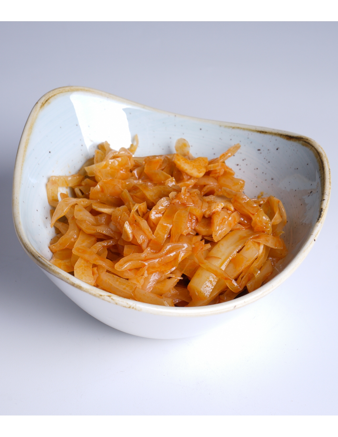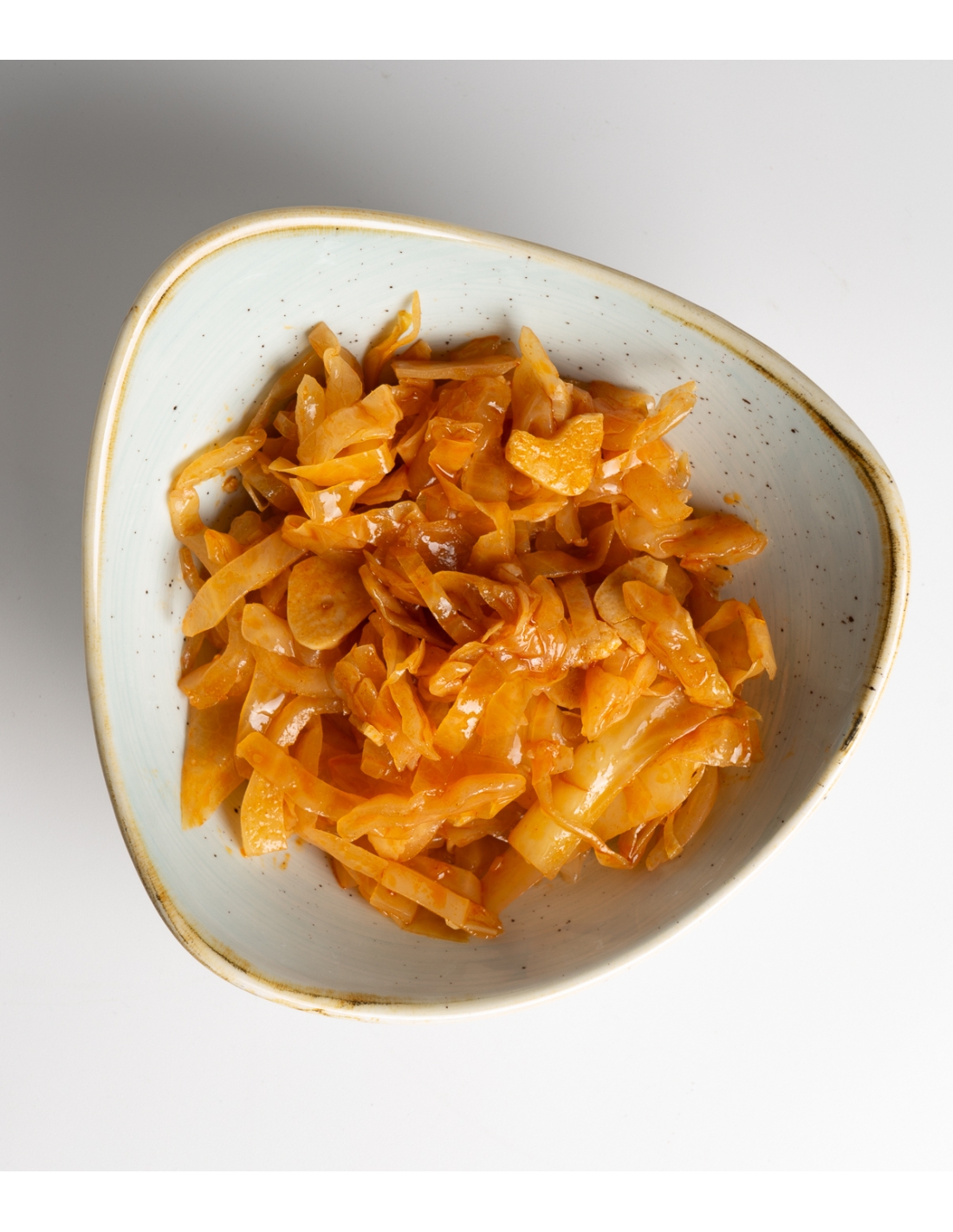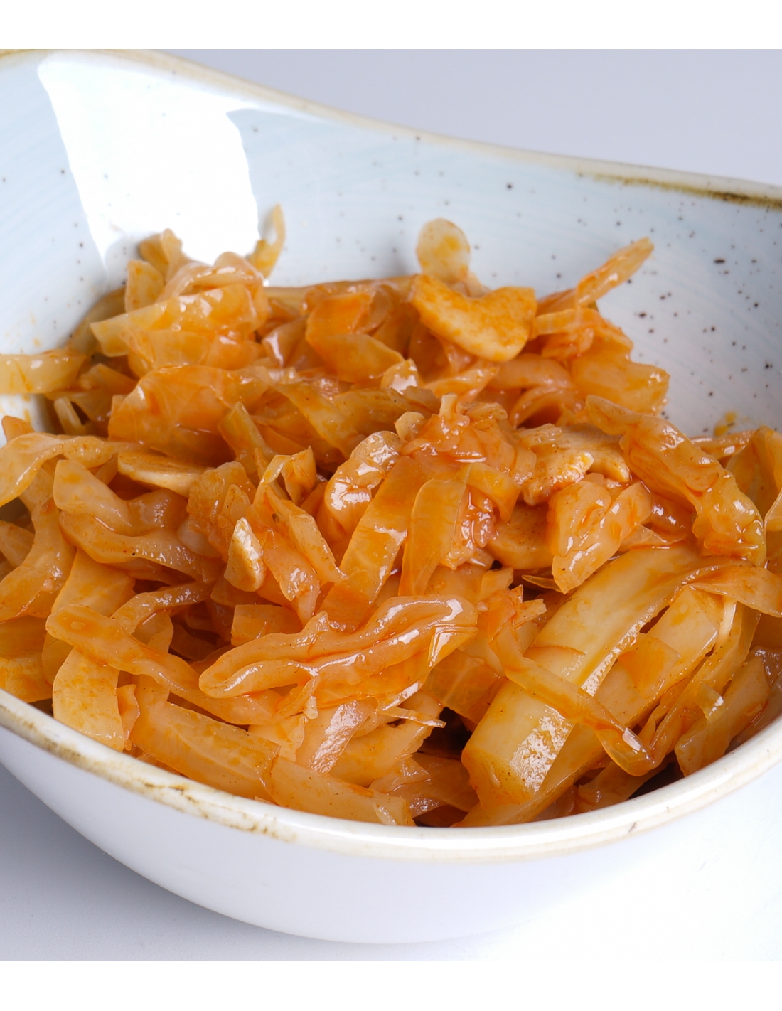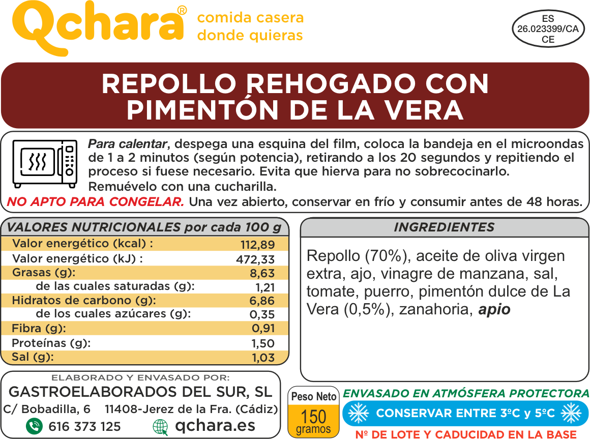 Nuestro Repollo rehogado al pimentón es una receta tradicional de la cocina casera, elaborada con ingredientes sencillos y naturales. El repollo fresco se corta en juliana y se saltea con ajo en aceite de oliva virgen extra, aromatizándose con pimentón dulce de la Vera para darle su característico sabor ahumado. Un toque final de vinagre de manzana aporta frescura y equilibrio.