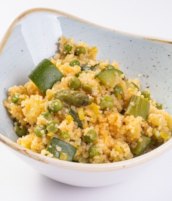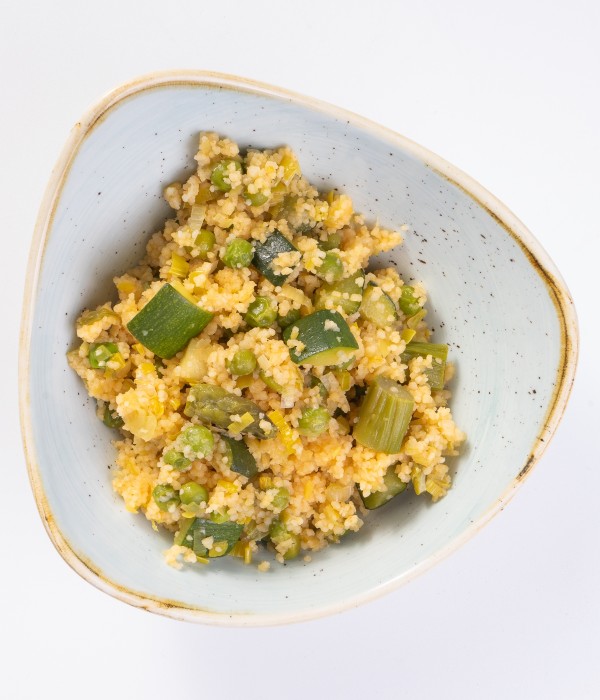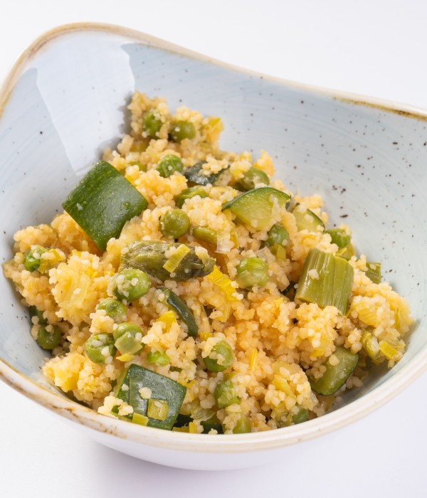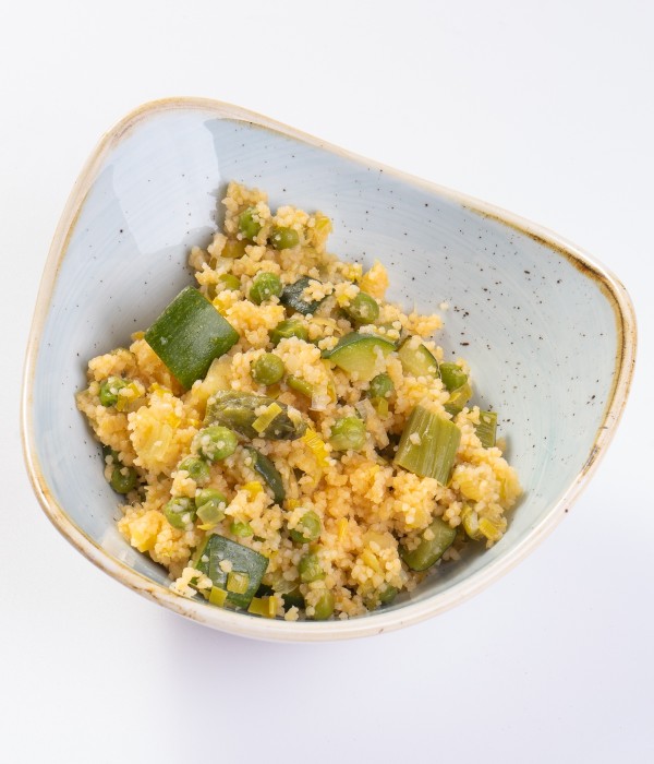 Nuestrocuscús con verdurases una receta sabrosa, equilibrada y muy versátil. Elaborado con puerros, calabacín, espárragos y guisantes, se combina con un caldo de verduras natural y un toque de pimentón de la Vera para potenciar su aroma. El resultado es un plato ligero, lleno de color y con todo el sabor de la huerta, perfecto tanto como guarnición como para disfrutarlo solo.