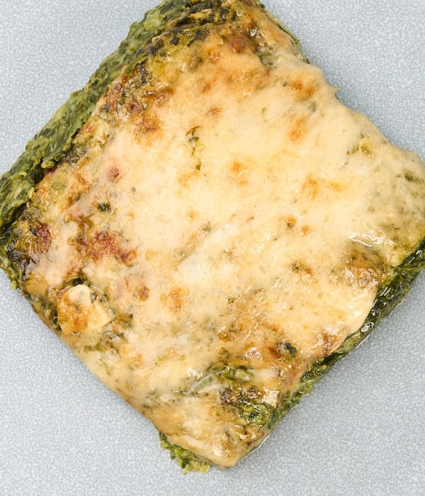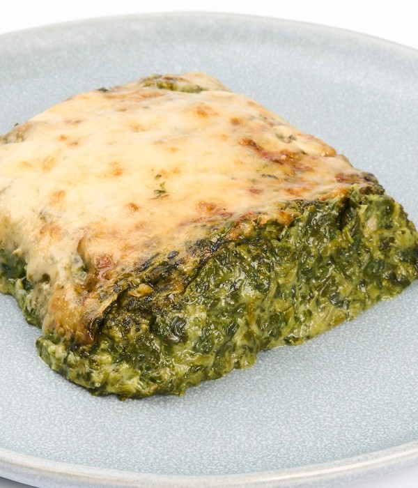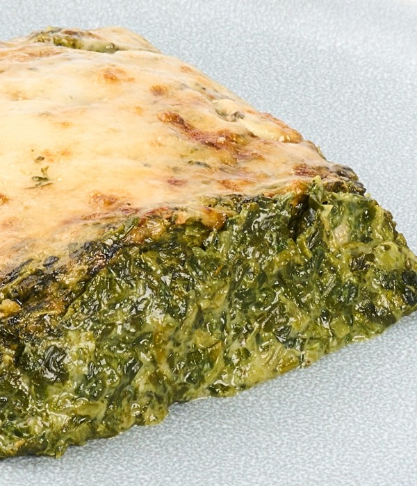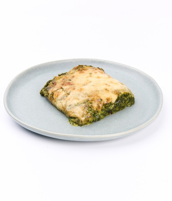 INGREDIENTES: Espinacas (63%), bechamel (31%) [leche (LÁCTEOS), mantequilla (LÁCTEOS), harina de trigo (GLUTEN), sal, pimienta blanca, nuez moscada], aceite de oliva virgen extra, queso grana padano (HUEVOS, LÁCTEOS), ajo, sal, nuez moscada.